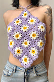 Indie Daisy Knit Halter Neck Crop Top in Purple Color for Indie Kids and 60s Aesthetic Outfits. Looks good for Art Hoe Aesthetic, Coconut Girl Style, Softie, and Plant Mom Outfits.