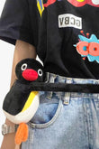 Pingu Penguin Plush Toy Belt Bag in Black color for Pingu Aesthetic and Kidcore Outfits. Looks good for Y2K Fashion, Weirdcore, Cartooncore, and Meme.