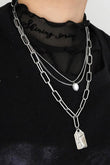 Face Tag Three Layer Chain Necklace in Silver color for Alternative Aesthetic and Art Hoe Outfits. Looks good for Breakcore, Grunge Aesthetic, and Sukeban Aesthetic.